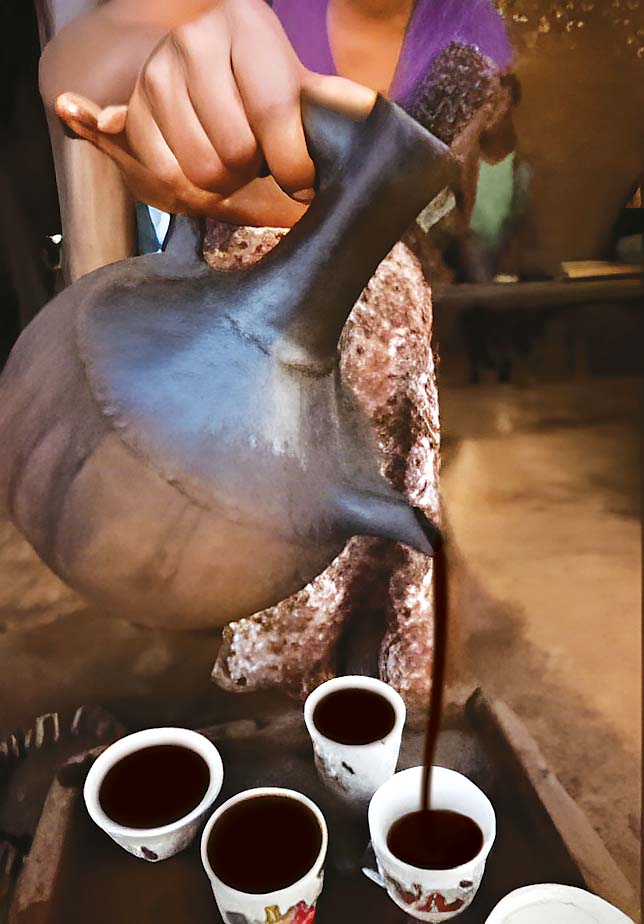 During a traditional Kefa coffee ceremony, green coffee beans are roasted in a flat pan, filling the air with an intoxicating aroma. The roasted beans are ground by hand and brewed in a clay pot called a jabena. The coffee is served in small handleless cups, and it's considered impolite to refuse a cup. Coffee is a symbol of respect and friendship in Kefa; it's a way of life passed down through generations.